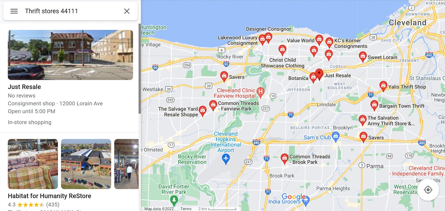 You first have to know what you are working with. Consider this step one in your reselling journey. Go on to google maps at your house and search for “thrift stores” and set the radius to how many miles you think is a reasonable distance to travel to a thrift store. I suggest 25 to 50 miles to start. This is going to give you an idea as to how many stores you can buy inventory from. The more thrift stores in your area the better.